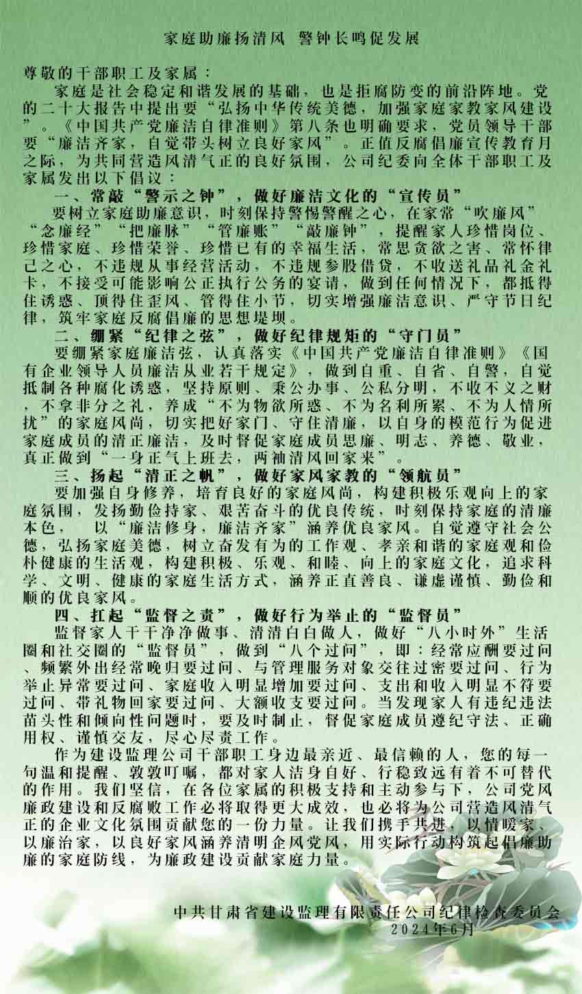 甘肃省建设监理有限责任公司家庭助廉倡议书