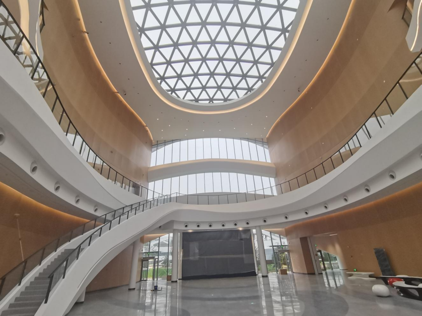 塔台采用钢结构斜交网格外框+钢筋混凝土核心筒,空管工作区采用钢筋混凝土框架+首层BRB支撑+基础橡胶隔震支座,钢结构总量达3561吨,且工艺复杂,高空拼装难度大;室外幕墙采用多曲铝板,铝板龙骨定位及安装难度较大。面对复杂的施工工艺和高难度的安装要求,公司协同施工单位综合运用BIM模型+泰克拉软件、BIM+犀牛三维坐标定位等方法,对施工点位及安装位置进行反复测量复核,保证钢结构及幕墙铝板安装效果,有效减少返工,实现高效率施工。室内装饰装修区域涉及三个大跨度、超高、异形GRG吊顶安装,设计造型复杂,安装施工难度较高。为确保吊顶安装的精度和美观效果,公司协同施工单位采用3D扫描仪进行原始空间点位扫描,对图纸进行单元划分模块,进一步优化安装方案,提高安装精度。