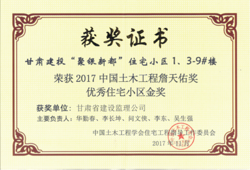 甘肃省建设监理有限责任公司监理的聚银新都住宅小区,以其15.6万平米的超大体量和卓越品质荣膺“2017年中国土木工程詹天佑奖优秀住宅小区金奖”“2016年度甘肃省建设工程飞天奖”,成为公司高质量发展征程中熠熠生辉的里程碑!