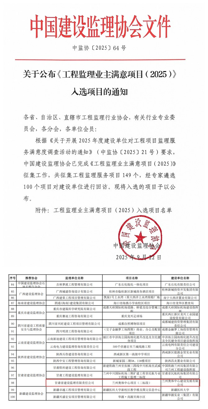 近日,中国建设监理协会公布2025年度工程监理业主满意度调查结果,省建设监理公司监理的兰州奥体中心项目荣耀登榜!这份沉甸甸的荣誉,是对公司监理服务水平与专业实力的权威认证,更是我们践行“客户至上、品质为先”服务理念的最佳见证。