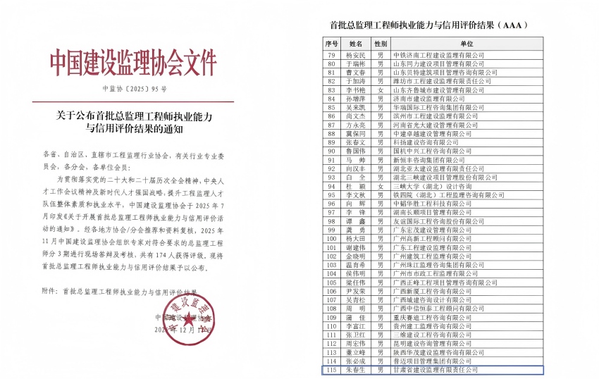 首批总监理工程执业能力与信用评价活动,由中国建设监理协会组织,经地方协会推荐申报、资料复核,中国建设监理协会组织专家现场答辩、考核,评选标准严苛、竞争激烈,全国范围内仅124人获评AAA级评价,朱春生同志能够脱颖而出,既是对个人专业能力与职业信用的高度认可,也充分彰显了公司在高端监理人才培养和综合实力建设方面的突出成效。