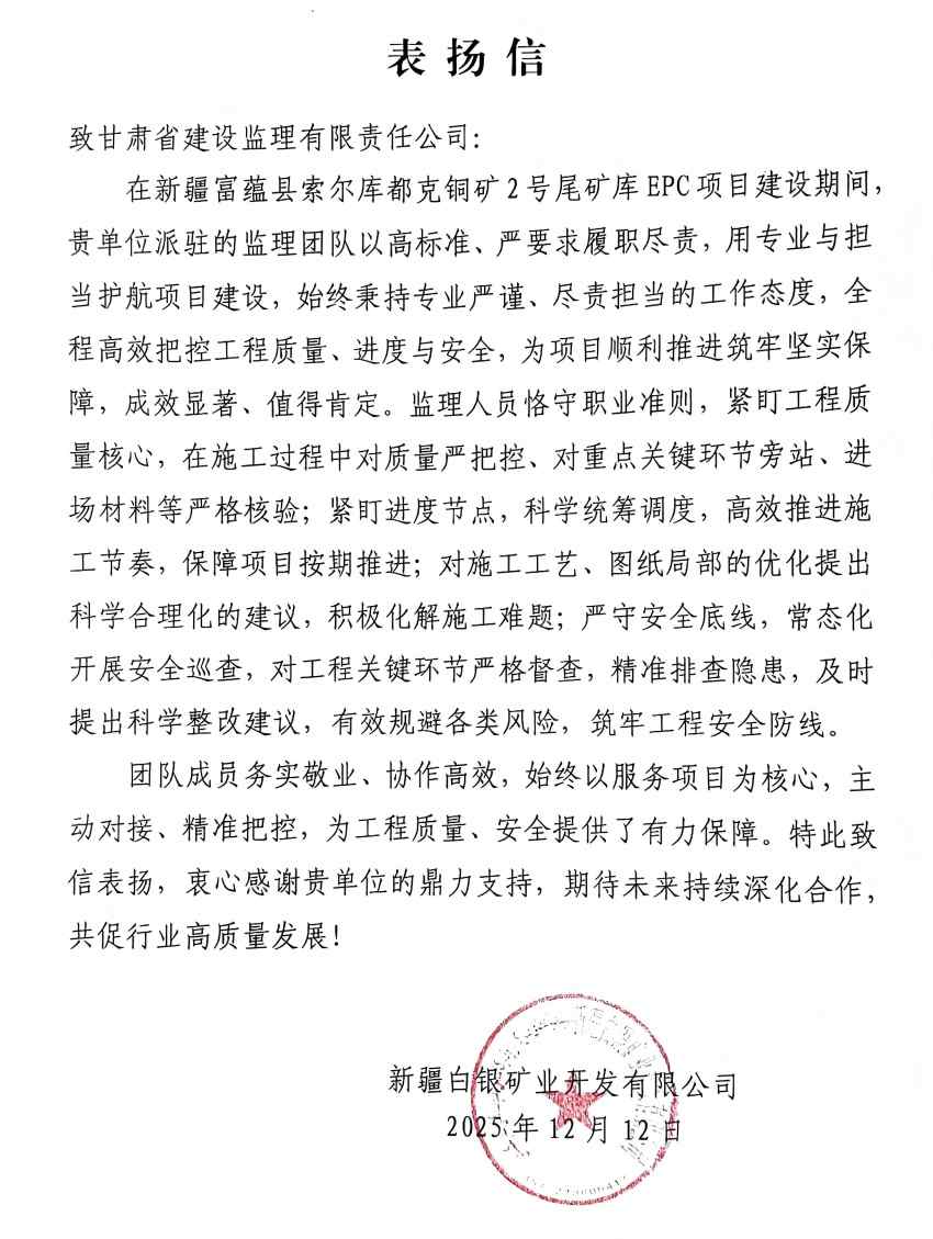 项目监理团队以精湛技术和高效服务为基石,全面管控工程质量、安全、进度、投资及合同信息。通过严格执行规范、精准优化方案、协调解决难题,确保了实体质量优良、安全生产平稳、关键节点如期完成。团队的专业素养与优质服务,赢得了建设单位新疆白银矿业开发有限公司的高度认可与书面表扬,为深化长期战略合作奠定了坚实基础。