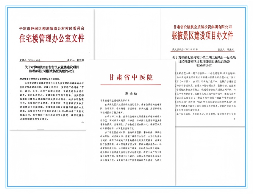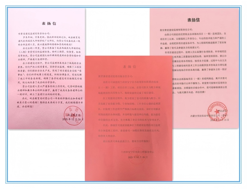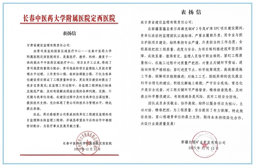 近期,省建设监理公司陆续收到来自长春中医药大学附属医院定西医院、新疆白银矿业开发有限公司、平凉市崆峒区柳湖镇南台村村民委员会住宅楼管理办公室、甘肃省中医院、格尔木市察尔汗行政委员会、某部队等40多个监理项目建设单位发来的表扬信。信中对公司派驻项目监理部的专业能力、敬业精神、服务质量给予了高度评价和衷心感谢。这一份份厚重的认可,不仅是对一线监理人员辛勤付出的最好褒奖,更是对公司持续提升监理服务品质、深度践行客户承诺成果的集中体现。