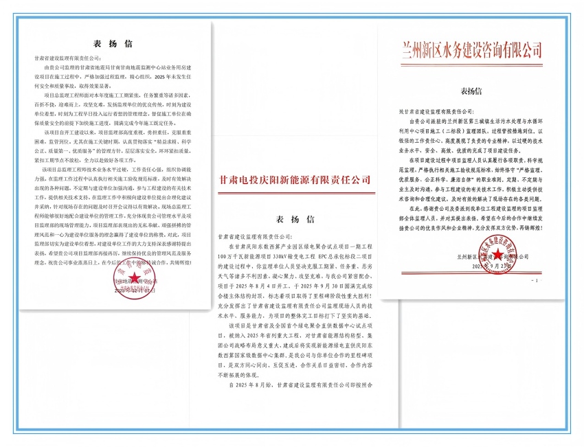 接连而至的表扬信,是鼓舞全体干部职工再接再厉、再创佳绩的强劲动力。这份荣誉属于每一位奋战在一线的监理人员,属于公司上下同心协力的奋斗集体。公司谨向奋战在一线的监理人员表示衷心的感谢与诚挚的慰问!每一封表扬信都镌刻着你们的汗水与智慧,每一次工程顺利推进都凝聚着你们的担当与付出。